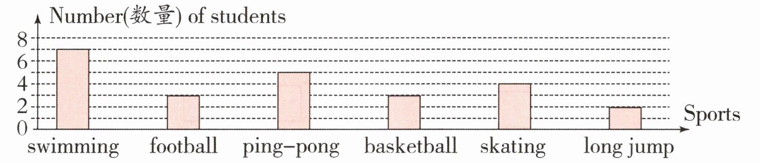 1.B 2.C 3.A 4.B 5.C 1. 由图表可知,选择游泳的人数最多,故选 B。2. 由图表可知,7+3+5+3+4+2=24,所以麦克斯的班里共有 24 人,故选 C。3. 迈克球类打得比较好,所以他可以选择篮球,故选 A。4. 由图表可知,体育课中有 6 种项目,故选 B。5. "long jump"的意思是"跳远",故选 C。