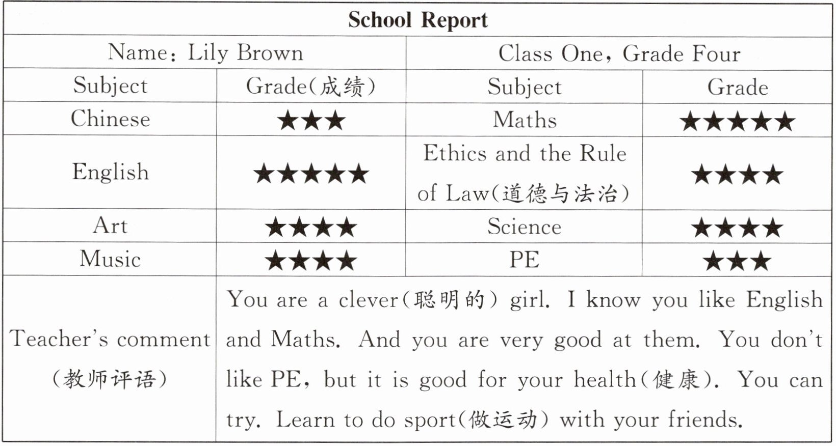 四、新语篇 成绩单 阅读 Lily 的成绩单,完成下列各题。