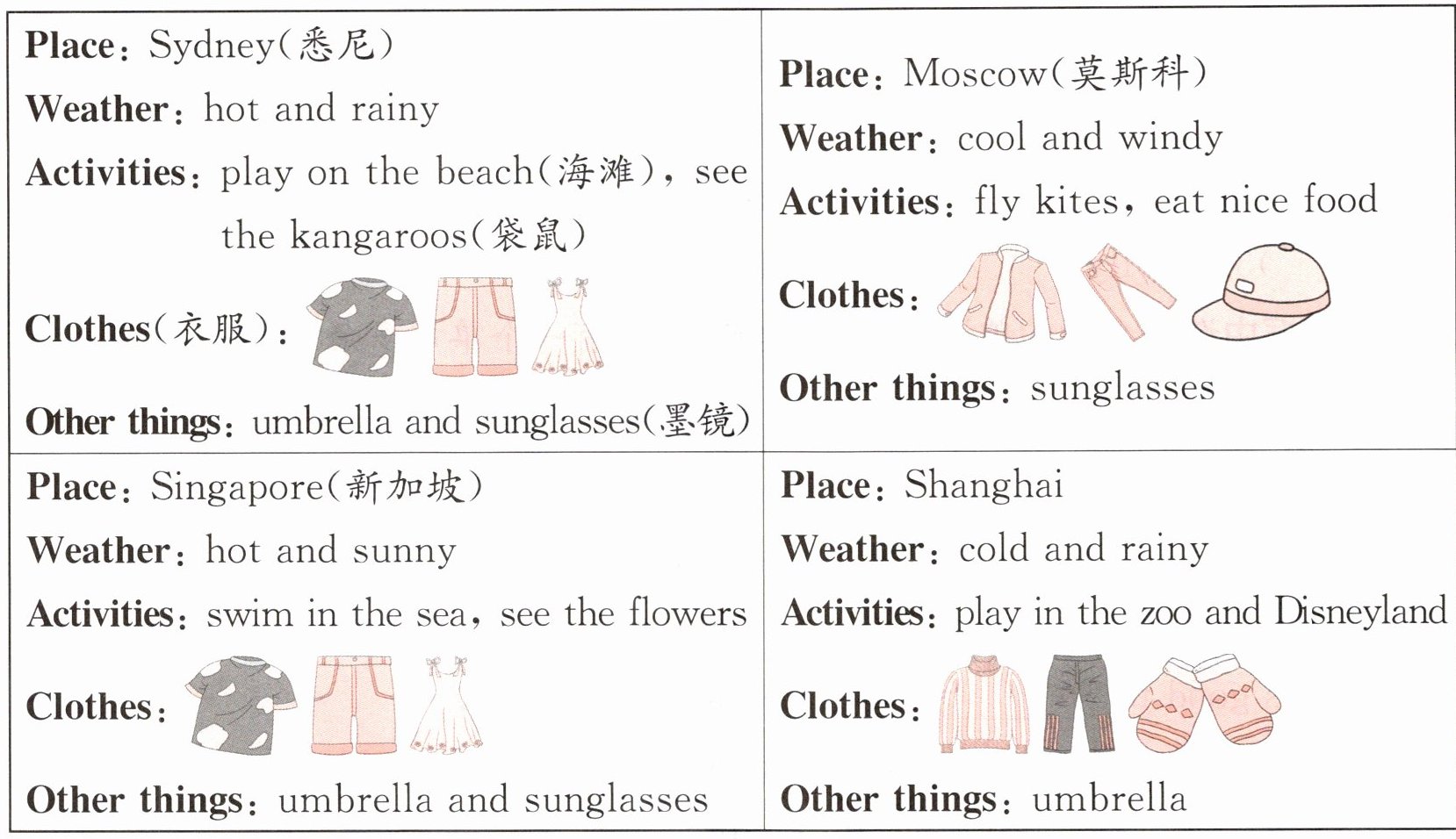 |Place: Sydney(悉尼) Weather: hot and rainy Activities: play on the beach(海滩),see the kangaroos(袋鼠) Clothes(衣服): Other things: umbrella and sunglasses(墨镜)|Place: Moscow(莫斯科) Weather: cool and windy Activities: fly kites,eat nice food Clothes: Other things: sunglasses|