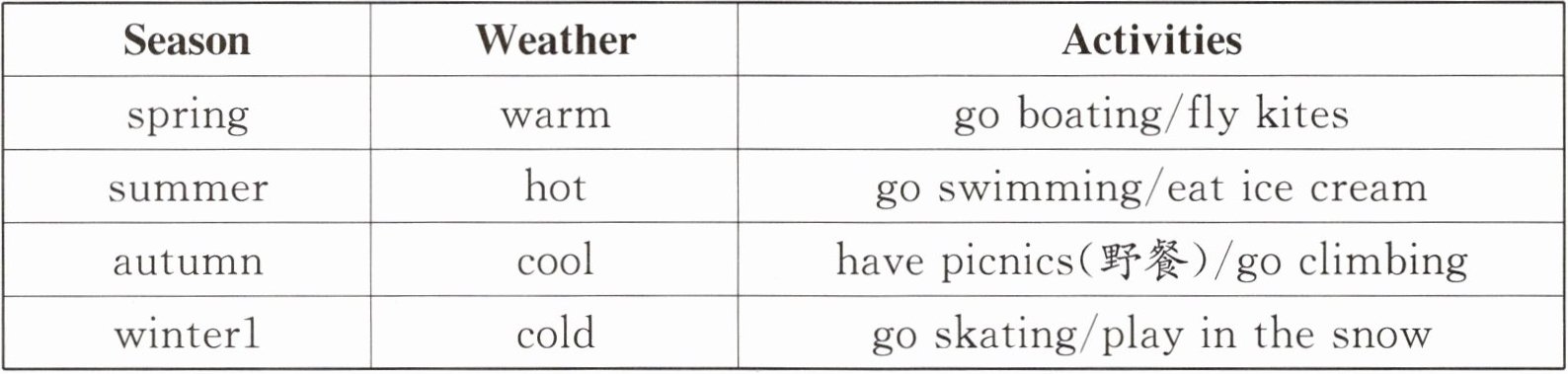 六、根据表格所提供的信息和实际情况,仿照例句,写一写其余季节的活动。