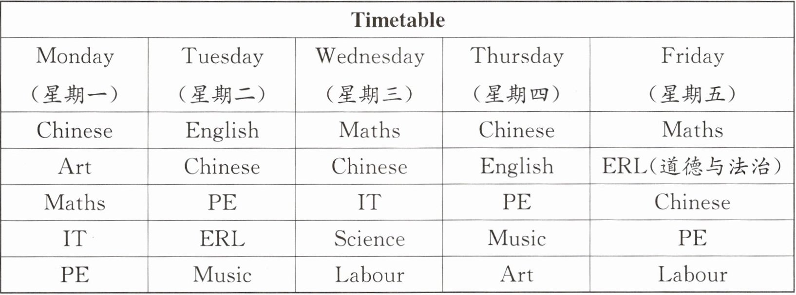 This is my timetable. I have five subjects in a day. I like Maths best. I am good at numbers. I am happy in the class.(答案不唯一)