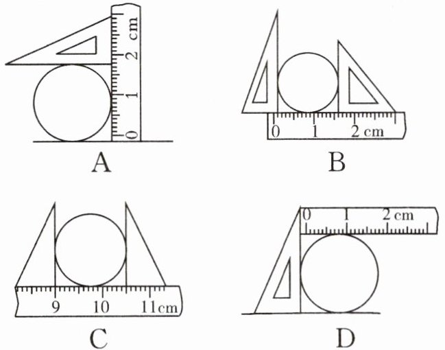 4 如图所示,用刻度尺和三角板测量一圆柱体的直径,其中正确的是( )。