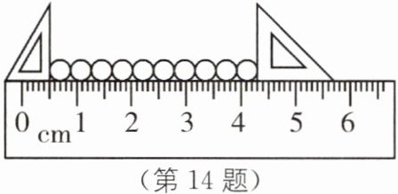 14 学过长度测量后,小芳想测量小钢珠的直径。她的做法:在水平桌面上,将10个相同的小钢珠紧密排列成一排,用两个三角板在两端挡住,测出10个小钢珠的总长度,即可算出小钢珠的直径,如图所示。