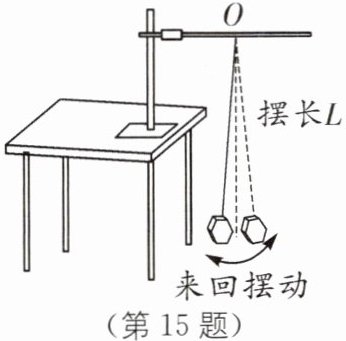 15 中考新考法 开放性实验设计 小羽同学通过阅读《伽利略对摆动的研究》内容,了解到“不论摆动的幅度大些还是小些,完成一次摆动的时间是一样的”。小羽用一条长绳的一端系一个螺母做成了一个摆,如图所示。想用秒表测出它摆动一个来回所用的时间(周期)。(注:摆长L是指绳子固定点O到重物重心的距离)