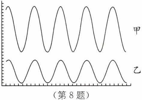 8 甲、乙两个物体振动相同时间,发出的声音信号输入同一设置的示波器中,显示的波形如图所示.下列判断正确的是( ).