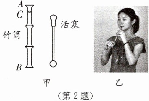 2 如图甲所示是一手工艺品,由竹筒(A、B两端开口,C处开一小口)和“活塞”组成,将活塞从B处塞入,在A处吹气并来回拉动“活塞”能发出悦耳的哨音,如图乙所示.下列说法正确的是( ).