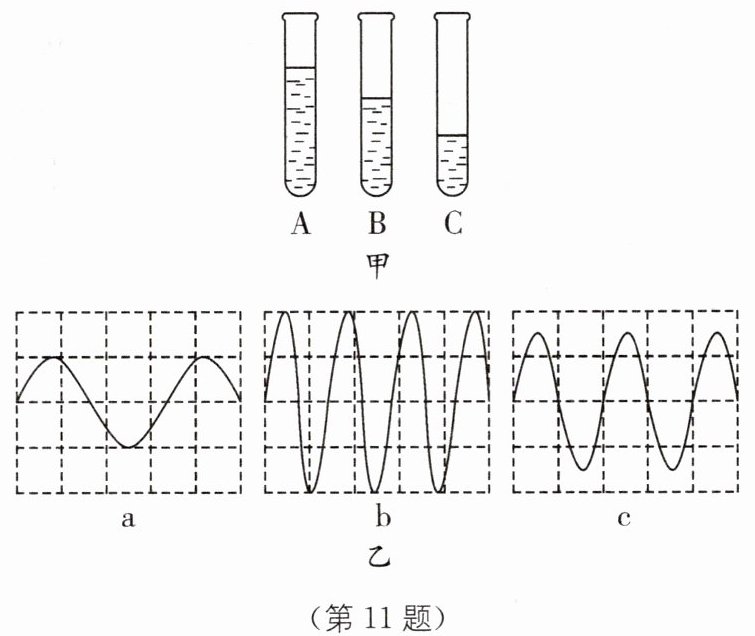 11 教材P22活动T2·拓展 向如图甲所示的试管中吹气,其中______试管发出声音的音调最高.如图乙所示的波形图中,音调和响度最低的是图______,响度最高的是图______.(填字母).