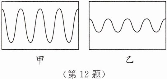 12 把音叉发出来的声音信号输入示波器,观察示波器上的图像.刚开始的时候,图像如图甲所示.过了几秒钟,图像如图乙所示.这段时间内声音的______和______没有改变,______改变了(以上三空均填“响度”“音调”或“音色”).该音叉1 s内振动了256次,则该音叉发出的声音频率为______Hz.