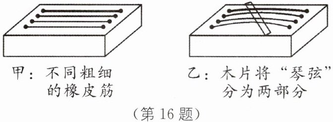 16 小林在物理活动课上用橡皮筋(粗细不同)、图钉、宽木片、纸盒等器材制作“四弦琴”,如图所示.制完调节后就可以用该“四弦琴”演奏简单的“乐曲”.