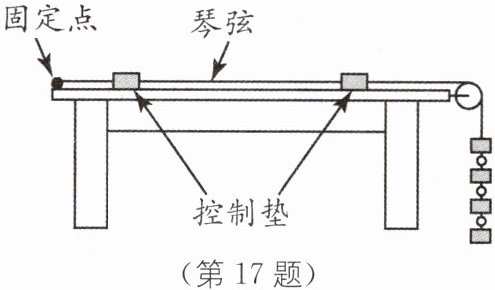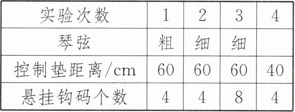17 小海想探究二胡演奏时,音调与琴弦松紧、长短、粗细的关系.他找来两根粗细不同的钢丝弦,设计了如图所示的装置,拨动控制垫间的琴弦,进行了四次对比探究,实验信息如表所示.