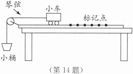 14 小王利用一根琴弦和一些简单器材制作了如图所示的“单弦琴”.拨动箭头处琴弦的同时左右移动小车,即可发出不同音调的声音.则小车向右移动,音调逐渐______;若小车静止在某位置,向小桶里再加些沙子,音调和原来相比会变______一些.