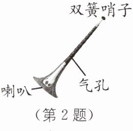 2 传统文化 民族吹管乐器唢呐 如图所示是我国民族吹管乐器——唢呐,用它吹奏名曲《百鸟朝凤》,模仿的多种鸟儿的叫声悦耳动听,让人仿佛置身于百鸟争鸣的森林之中.