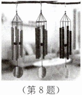 8 如图所示,微风吹过,金属管风铃发出悦耳的声音,小明想探究管子发出声音的频率与长度、直径的关系.他选取了材料与管壁厚度都相同的三根直管,将它们用细线悬挂,敲击后,测出各自发出声音的频率,数据如下表所示.