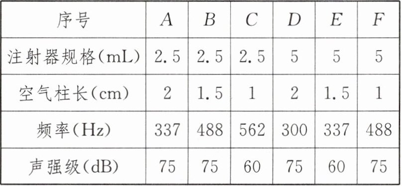 (1)分析表中数据可知,选用序号为A、B、C的三次实验对比可知,注射器规格相同,即空气柱的横截面积(或粗细)相同,振动的频率不同.管内空气柱越短,振动频率越高.音调越高.