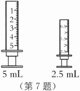 小明找来了两个未使用过的一次性注射器制成了一些哨子(如图所示).注射器的规格分别为2.5 mL和5 mL.他一边吹哨子一边调整注射器内空气柱的长度,同时利用专用仪器测出声音的频率和响度,测得的数据如下表所示.