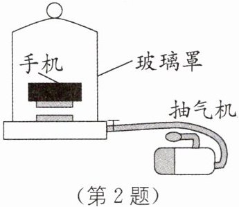2 如图所示,手机被置于密闭的玻璃罩内悬浮,致电这部手机时,持续铃响,启动抽气机,听到的铃声逐渐变小,直至听不到;重新放气时,人又听到铃声,以下判断正确的是( ).