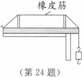 24 小江同学为了探究同种材料做的橡皮筋发出的声音的音调高低与张紧程度、横截面积、长度的关系,设计了如图所示的实验,采用了几个钩码和一个能够测量振动频率的仪器和甲、乙、丙、丁四根橡皮筋,其中甲、丙、丁张紧程度相同,与乙张紧程度不同.