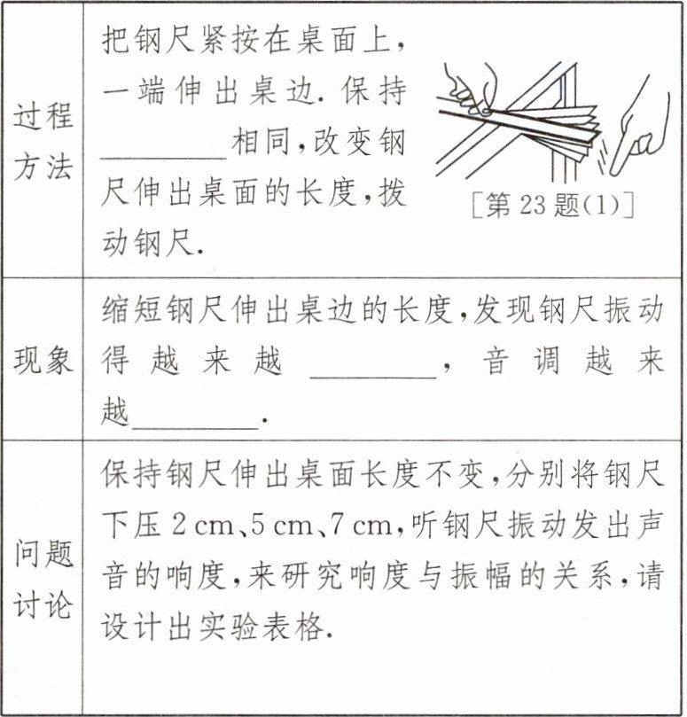 | 问题讨论 | 保持钢尺伸出桌面长度不变,分别将钢尺下压 2 cm、5 cm、7 cm,听钢尺振动发出声音的响度,来研究响度与振幅的关系,请设计出实验表格. |