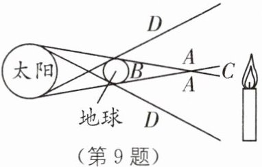 9 跨学科 半月食与光现象 月食是由于______现象形成的;半影月食是月亮通过地球的“半影”内的一种特殊天象,这时地球挡住了一部分太阳照向月球的光,月球看上去要比平时昏暗一些.如图所示,发生半影月食天象时,月亮位于图中的______(填字母符号)区.