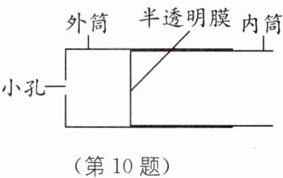10 教材 P46 练习 T2·变式 小欢用针孔照相机观察蜡烛的烛焰,若保持小孔和蜡烛的烛焰位置不变,如图所示,若内筒位置不变,半透明膜上烛焰的像是______(填“正立”或“倒立”)、缩小的______(填“虚像”或“实像”);若向右拉动内筒,半透明膜上烛焰的像将变______(填“大”或“小”).