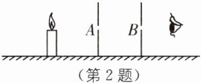 2 教材 P45 练习 T1·拓展 如图所示,小明想通过 A、B 两张纸片上的小孔看见烛焰,他应将烛焰、两个小孔和人眼调到______.看到的烛焰是______(填“正立”或“倒立”)的______(填“实像”“虚像”或“物体”).