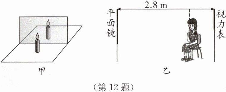 (3)检查视力的时候,视力表放在被测者的后上方,被测者识别对面墙上镜子里视力表的像. 如图乙所示,视力表与平面镜间的水平距离为2.8 m,要求视力表在镜中的像与被测者相距5 m,则人应坐在离平面镜______m的位置检查.