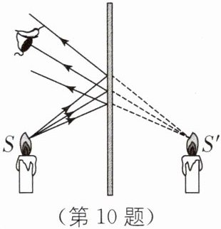 10 如图所示,小明通过平面镜看到了蜡烛的像,下列有关平面镜成像的描述,正确的是( ).