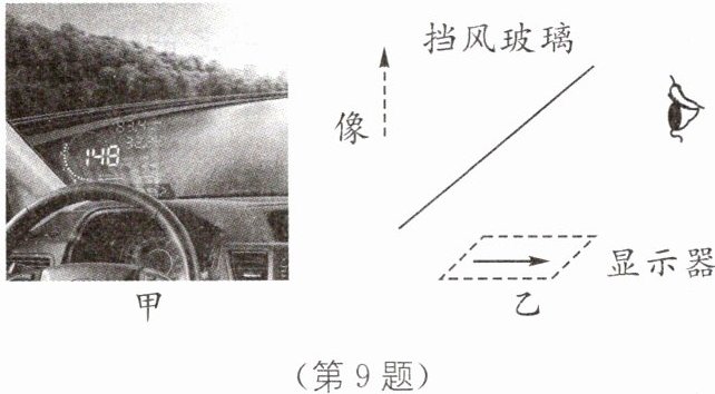 汽车抬头显示(如图甲所示)又叫汽车平视显示系统(Head-Up Display),简称HUD.HUD是为高速行驶的车辆研发的,是利用平面镜成像原理(如图乙所示),将显示器上的重要行车数据通过前挡风玻璃投射在正前方,驾驶员透过挡风玻璃往前方看的时候,能够轻易地将车外的景象与车辆信息通过挡风玻璃所成的像融合在一起.驾驶员不必低头,就可以看到车辆信息,如车速、油耗、导航等,从而避免分散对前方道路的注意力.