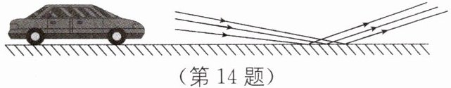 14 夜间行车驾驶员应该更加注意安全,如图所示是雨后夜间汽车在积水严重的沥青路面上行驶时大灯的部分光路简图. 请你根据学过的知识回答以下两个问题.