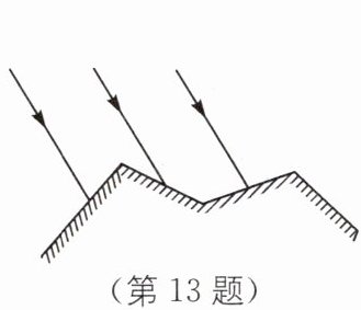 13 如图所示,三条互相平行的光线入射到凹凸不平的物体表面上,三条反射光线______(填“会”或“不会”)平行射出,这种反射______(填“遵循”或“不遵循”)光的反射定律.