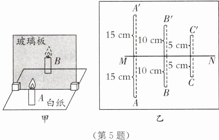 5 小华和同学们正在探究“平面镜成像的特点”,器材有茶色玻璃板、白纸、两支相同的蜡烛 A 和 B、火柴、刻度尺、铅笔.