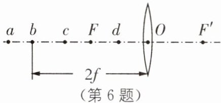 6 教材P73练习T1·改编 如图所示,若想在位于凸透镜右边的光屏上(图中光屏未画出)得到一个烛焰清晰放大的像,那么点燃的蜡烛应置于图中的( ).