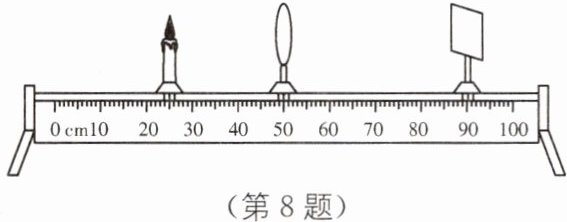 8.放大 15 逆时针 解析:如题图所示,物距u = 25cm,像距v = 40cm,物距小于像距,光屏上恰能成一个清晰的像,由凸透镜成像规律可知,此时成倒立、放大的实像;若将凸透镜向右移动15cm,此时物距u = 15cm + 25cm = 40cm,像距变为40cm - 15cm = 25cm,则根据折射时光路是可逆的原理可知,此时屏上即可再次成清晰的倒立、缩小的实像;若一个指针发光的钟表,其表面正对透镜,指针做顺时针转动时,根据凸透镜成实像时,像与物是上下左右颠倒的情景可知,在光屏左侧看向光屏时,光屏上指针所成的像做逆时针转动。