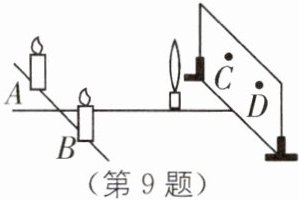9 蜡烛、凸透镜和光屏分别置于如图所示位置,两支蜡烛的连线AB与过凸透镜的中线垂直,若用一块厚纸板挡住A处的烛焰,在光屏上______(填“C”或“D”)处仍能得到一个清晰的像.由于蜡烛的燃烧,烛焰的高度逐渐降低,烛焰在光屏上的像将会偏离原来位置少许.要使像继续成在原来位置,可将凸透镜适当向______(填“上”或“下”)调节.