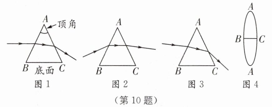 10 三棱镜是一种重要的光学元件,光通过三棱镜的传播路线是怎样的呢?当激光以一定角度射到三棱镜上,光路图如图1所示.改变入射角度,光路图如图2、图3所示.