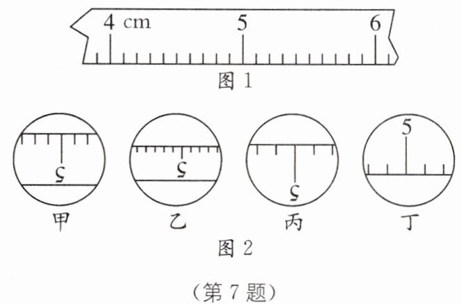 7 如图1所示是放置在水平桌面上的刻度尺的一部分,图2中甲、乙、丙、丁是通过凸透镜所看到的刻度尺的像. 若凸透镜先贴着刻度尺然后逐渐远离,则看到刻度尺的像的先后顺序正确的是______.