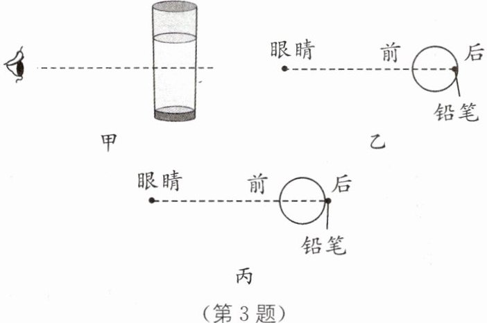 3 (2023·扬州中考)如图所示,在装有水的杯子里,小红将一支铅笔分别紧贴杯壁内、外竖直放置,两次都观察到铅笔放大的像,俯视图如图乙、图丙所示. 下列说法正确的是( ).