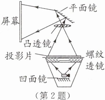 2 如图所示,若要增大屏幕上的像,则像距要增大,屏幕固定时投影仪要向______(填“左”或“右”)移;同时物距要减小,镜头要向______(填“上”或“下”)调. 投影仪上的平面镜的作用是______,使像成在屏幕上,不改变像的大小.