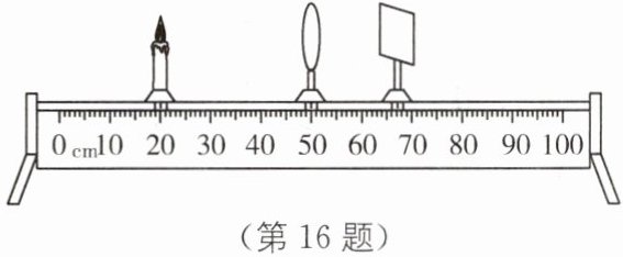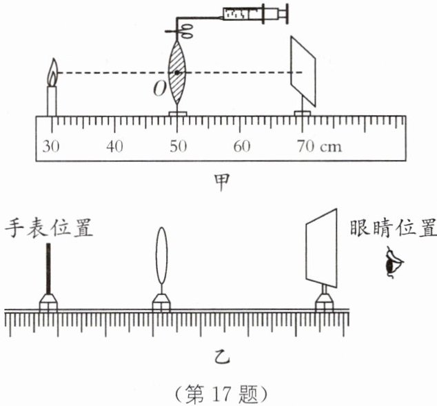 17 如图所示,小亮用自制的水透镜来探究凸透镜成像规律. 当向水透镜里注水时,水透镜的焦距将变小;当从水透镜里抽水时,水透镜的焦距将变大. (1)实验前,他先将蜡烛、水透镜和光屏放在同一直线上,点燃蜡烛后,发现光屏上的光斑偏在光屏下侧,为了将烛焰的成像位置调节至光屏的中央,他应将水透镜的位置______(填“升高”或“降低”)一些. (2)当小亮移动烛焰、水透镜和光屏至如图甲所示位置时,恰能在光屏上得到清晰的像(像未画),现保持烛焰和透镜的位置不变,往透镜中注入一些水,要在光屏上再次成清晰的像,需将光屏向______(填“左”或“右”)移动,此时,成的像跟物体相比______(填“放大”“缩小”或“等大”)了. (3)小亮又在实验室找到一只正在正常计时、带指针的手表,他将手表在光具座上固定好(如图乙所示),然后用强光照射手表,使它通过水透镜成像;左右移动光屏,当透光性较好的薄塑料光屏(半透明)上出现明亮清晰的手表的像时,小亮从光屏的右侧朝向光屏观察,他在光屏上看到手表的像的指针沿______(填“顺时针”或“逆时针”)方向转动.