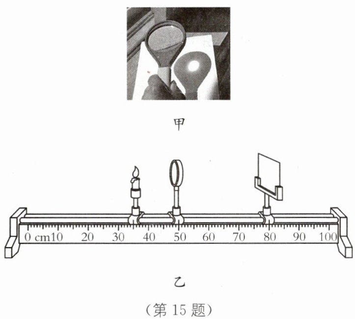 15 教材P71学生实验·拓展(2024·长沙中考)为了探究凸透镜成像的规律,小明找到了一个焦距未知的凸透镜. (1)如图甲所示,在利用太阳光测量凸透镜焦距的过程中,小明发现凸透镜靠近白纸时,纸上的光斑越来越大. 接下来,他应该使凸透镜与白纸之间的距离变______,直至白纸上的光斑变得最小、最亮. (2)某次实验时烛焰在光屏上成清晰的像,如图乙所示,这个像是______、______的实像.