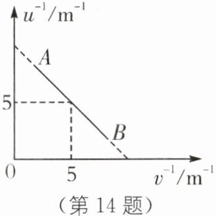 14 如图所示,线段AB为一凸透镜成像的物距倒数1/u和像距倒数1/v的对应关系图像,若用此凸透镜成像,当物体距透镜 0.3 m 时,物体所成像的性质是______(需说明像的虚实、大小、正倒情况).