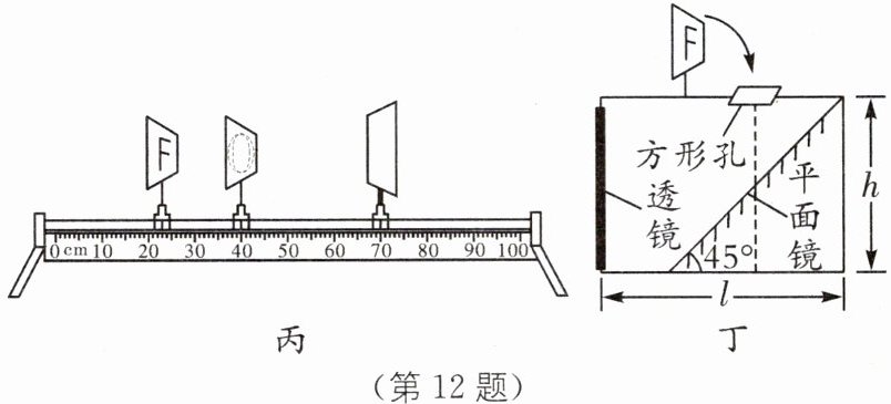 (4)在了解了该透镜的成像规律后,小红用长方形不透明纸盒、平面镜和该透镜设计制作了一个投影仪,其剖面图如图丁所示,平面镜与底面夹角为45°,平面镜的中心位于透镜的主光轴上,盒上方开一方形孔,将“F”光源按照如图所示的方式朝下平放在方形孔上、中心与平面镜的中心在一条竖直线上,若盒子高度h为10 cm,为保证在正对透镜前方的屏幕上能看到一个放大的投影,则盒子长度l的范围为______cm,屏幕上所成的图像形状是______(填“”“”或“”).