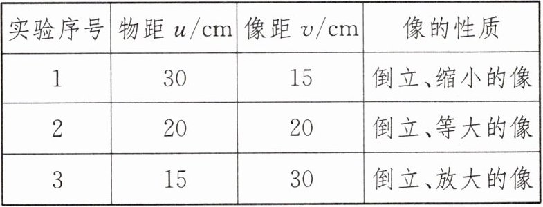 |实验序号|物距u/cm|像距v/cm|像的性质|