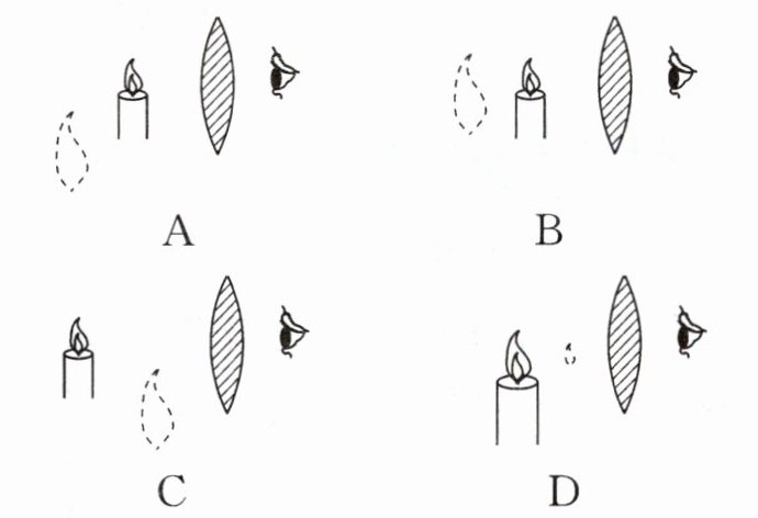 9 在“探究凸透镜成像规律”的实验中,当烛焰位于凸透镜一倍焦距内时,眼睛通过凸透镜观察到的虚像可能是图中的( ).