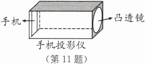 11(2024·聊城中考)在学习了凸透镜成像规律后,小慧同学计划制作一个“手机投影仪”.现有器材如下:焦距分别为10 cm、20 cm、30 cm的凸透镜各一个,手机一部,长为30 cm的纸盒,胶带和剪刀等.“投影仪”模型如图所示,将手机和凸透镜分别固定在纸盒的两端,调整“投影仪”到墙面的距离,可在墙上看到手机画面清晰放大的像.下列说法正确的是( ).