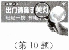 10 小京通过焦距为10 cm的凸透镜看到了提示牌上“关灯”两字放大的像,如图所示.下列说法中正确的是( ).