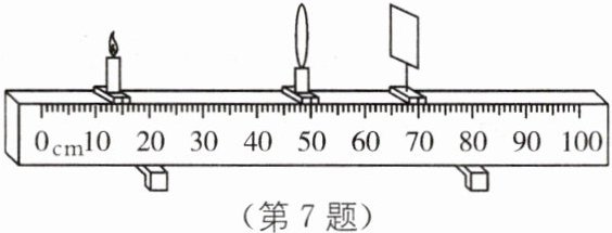 解:由图可知,蜡烛在10cm刻度处,凸透镜在50cm刻度处,光屏在70cm刻度处。物距u=50cm-10cm=40cm,像距v=70cm-50cm=20cm,此时u>v,成倒立、缩小的实像,是照相机的成像原理。