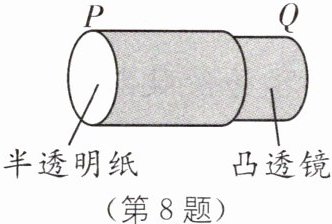 8.A [解析]本题考查凸透镜成像特点.半透明纸上呈现蜡烛火焰等大的实像时物距等于像距等于二倍焦距;看到大树在半透明纸上的像时,物距变大,像距变小,物距大于凸透镜二倍焦距,像距在凸透镜一倍焦距和二倍焦距之间,成倒立、缩小的实像.故选A.