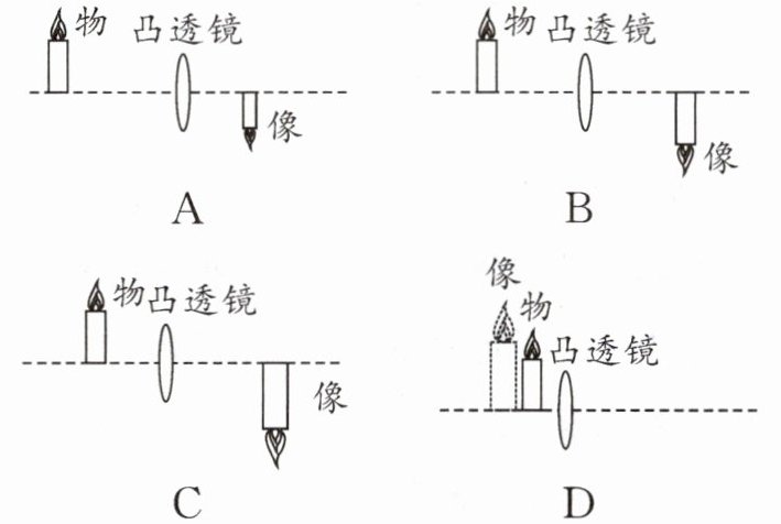 8(2024·济南中考)物理实践活动课上,小明将半透明纸蒙在较粗纸筒的P端,将凸透镜安装在较细纸筒的Q端(凸透镜未画出),两纸筒套在一起组成模拟照相机,如图所示。通过调节P、Q的间距,他看到桌子上蜡烛的火焰在半透明纸上成的是等大的像,再次调节P、Q的间距,他看到窗外更远处大树在半透明纸上成的像。下列对大树的像描述正确的是( )。