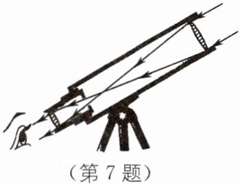 7 如图所示,望远镜通常由两个透镜组成,靠近眼睛的透镜叫作______,靠近被观察物体的透镜叫作______.利用物镜使远处的物体成______的实像,这个实像再经过目镜放大,就能看清楚较远处的物体了.